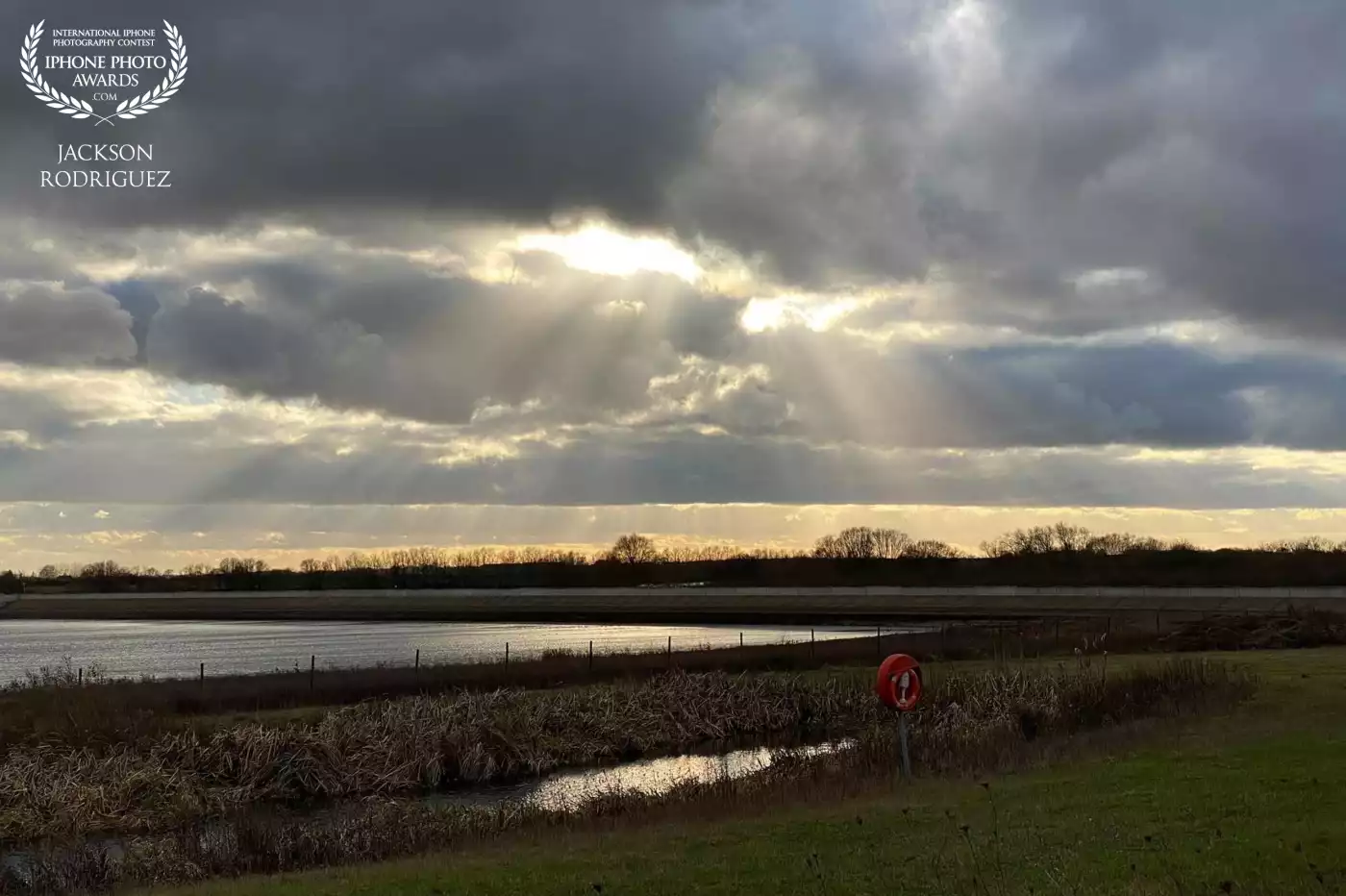Sunbeams break through heavy clouds over a quiet waterside landscape, casting soft light across the river, grassy banks, and distant tree line.