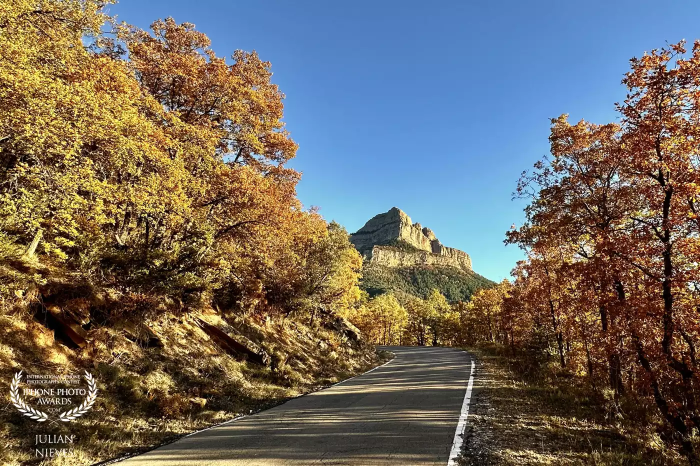 Los bonitos colores del otoño nos acompañan a lo largo de la carretera subida al monte Oroel-Jaca para disfrutar las bellas vistas de los pirineos.