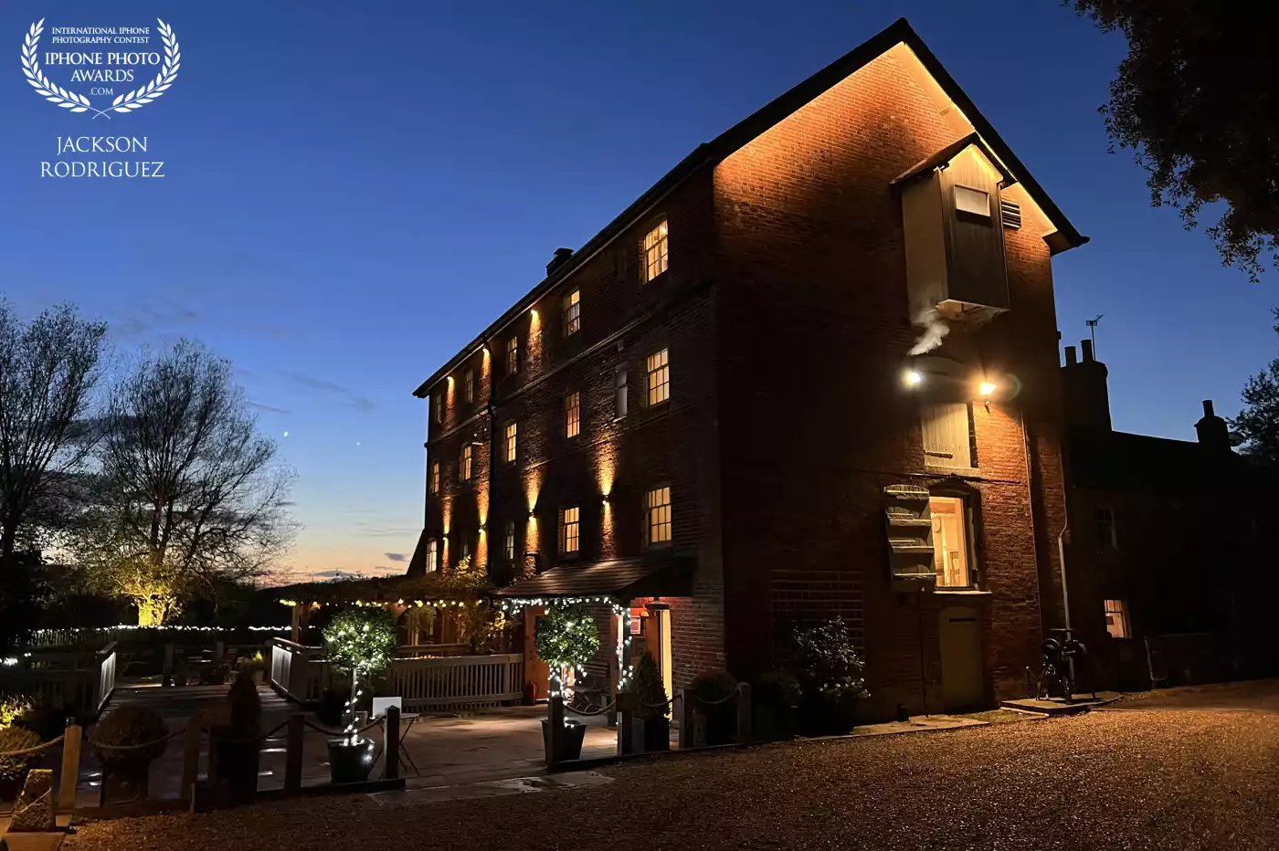 A beautiful brick building glowing with warm lights during twilight, set against a deep blue evening sky. Sopley Mill, ๐ฌ๐ง