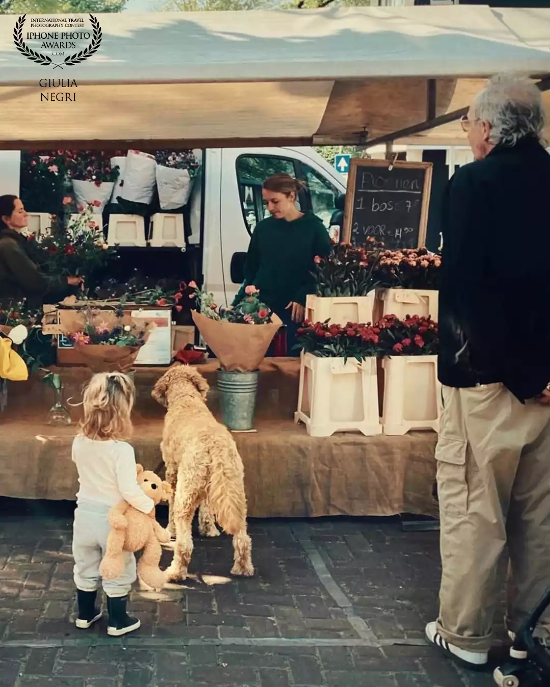 A little girl, her dog and her teddy pick their favorite flowers on a sunny Saturday morning at the Noordermarkt (Amsterdam)