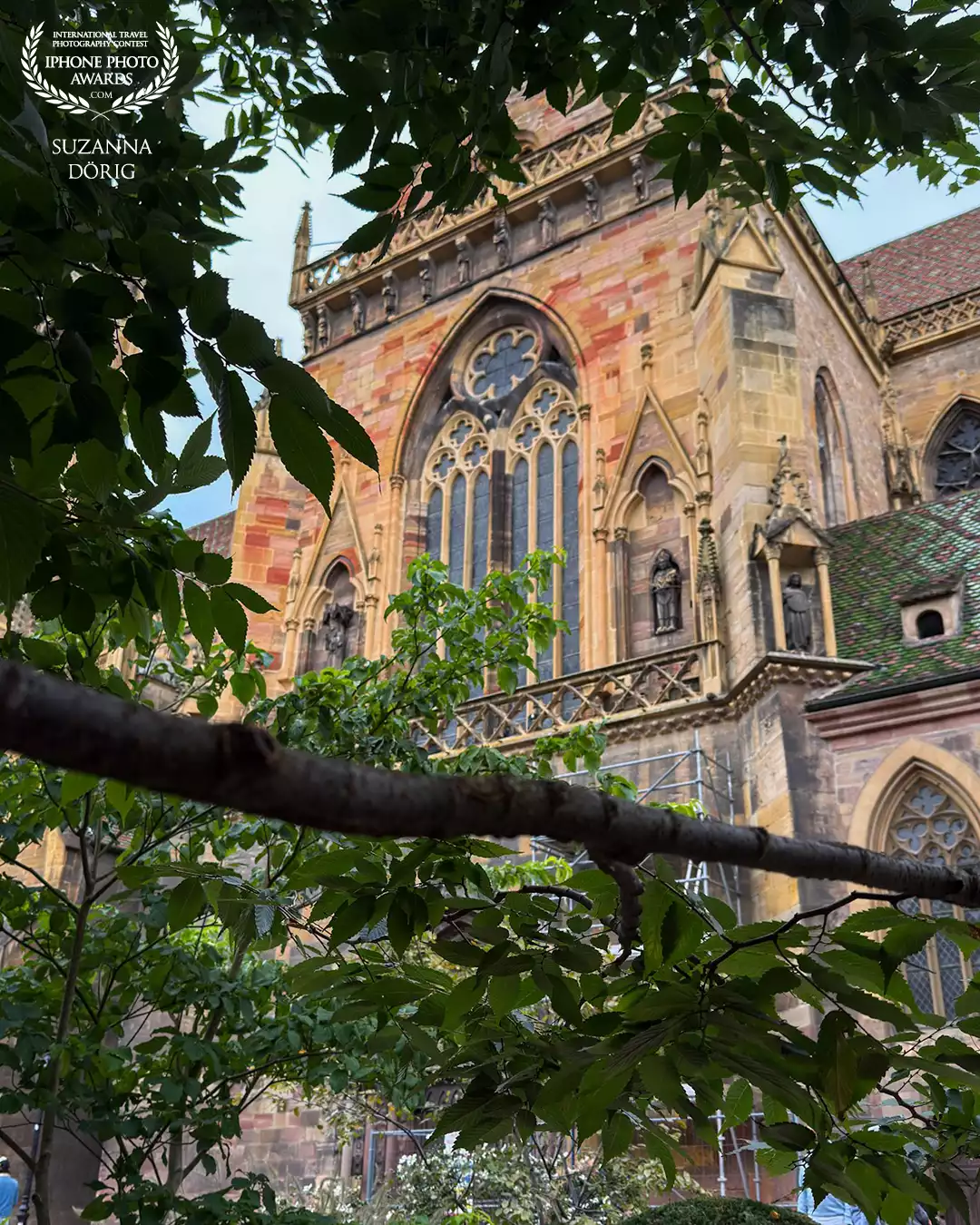 The Gothic St. Martin’s Cathedral from the 13th century stands in the central Place de la Cathédrale in Colmar. The city is located on the Alsace Wine Route, which is known for Riesling and Gewürztraminer from the region.