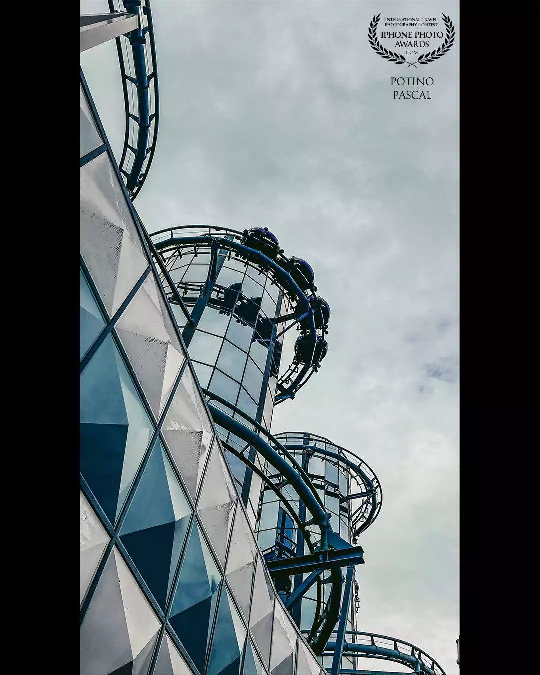 A futuristic ride captured in a theme park, where geometric lines and glass spirals twist under a milky sky. A playful yet cinematic architectural scene, shot on iPhone.