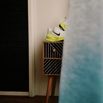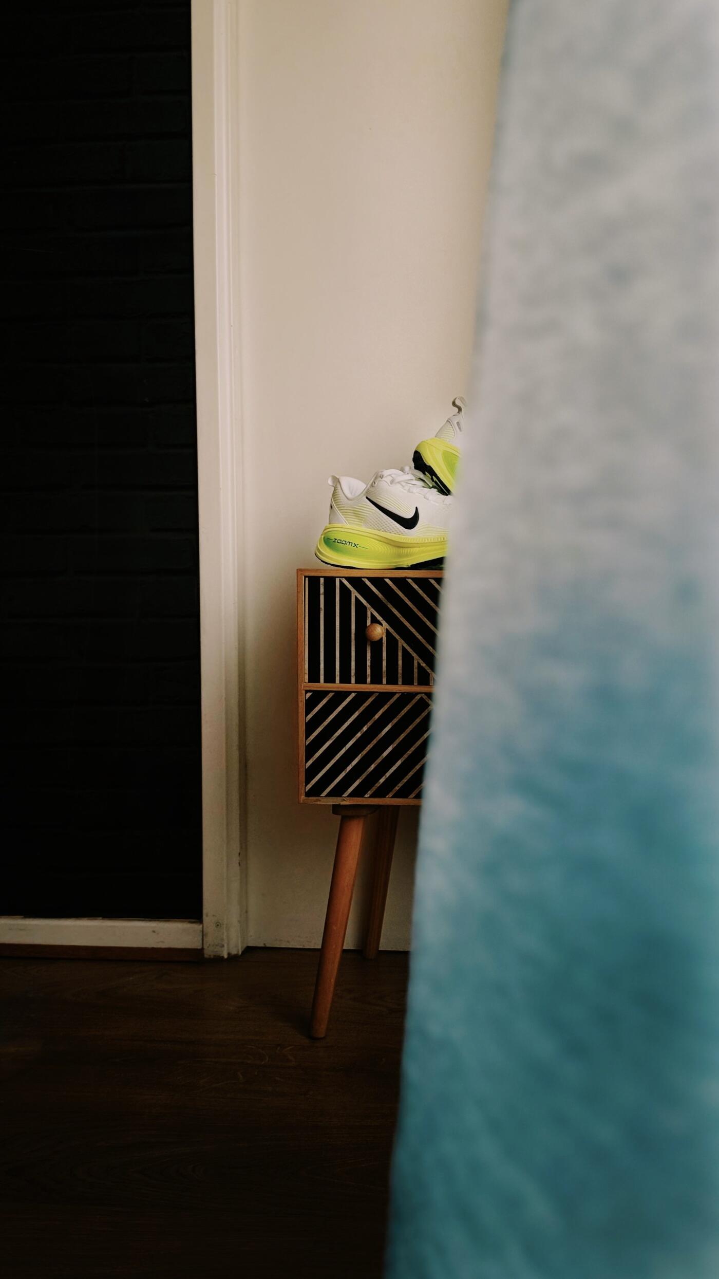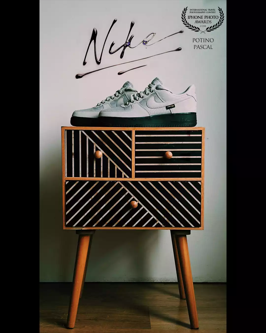 97th CollectionUne paire de Nike posée sur un meuble graphique en bois. Un dialogue visuel entre design, culture urbaine et équilibre des formes. Photo réalisée et éditée sur iPhone.