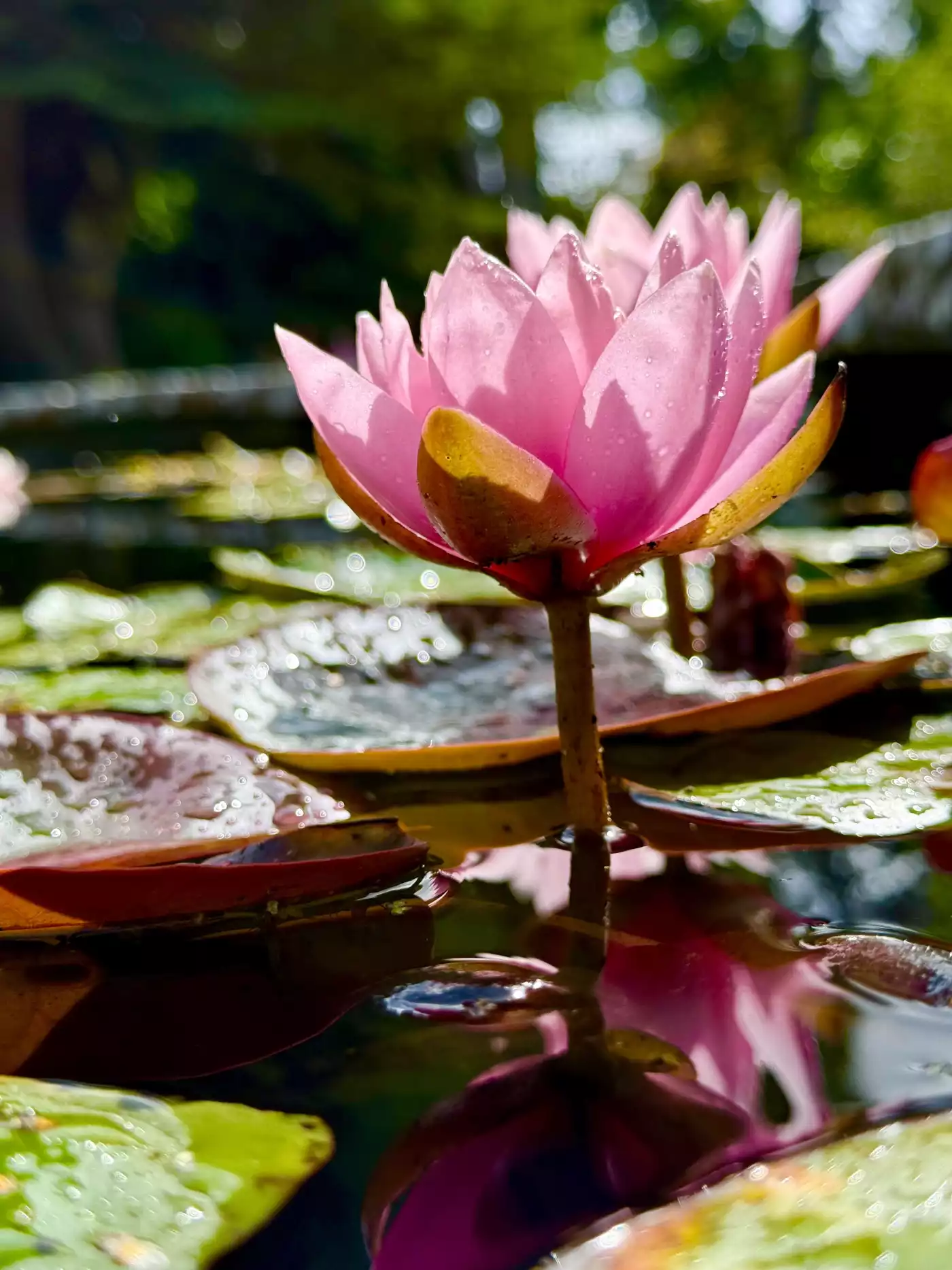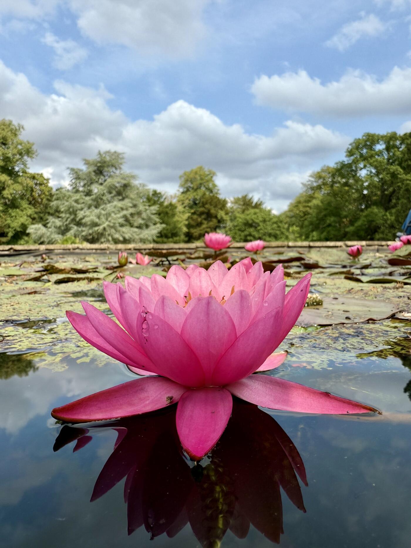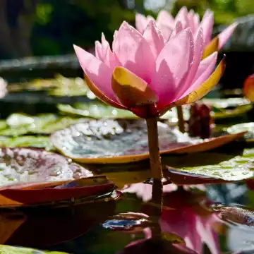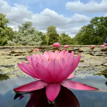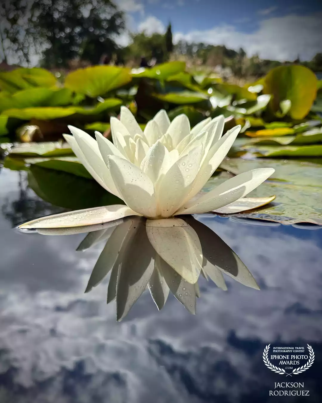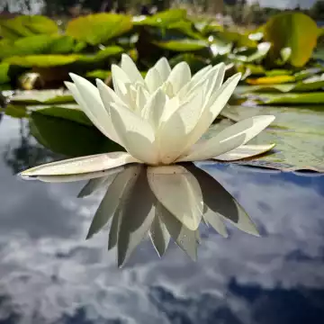 101st CollectionA serene white water lily floating on calm water, its delicate petals mirrored perfectly in the reflection, with soft greenery and sky blurred in the background.