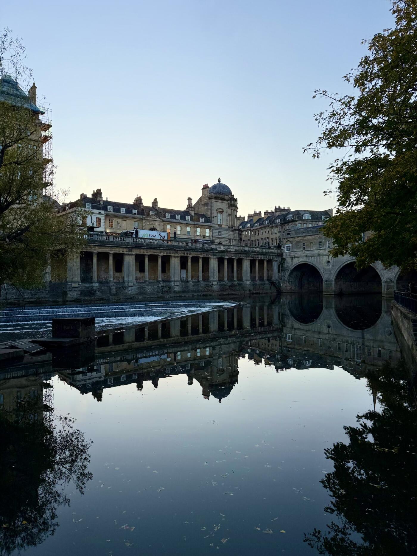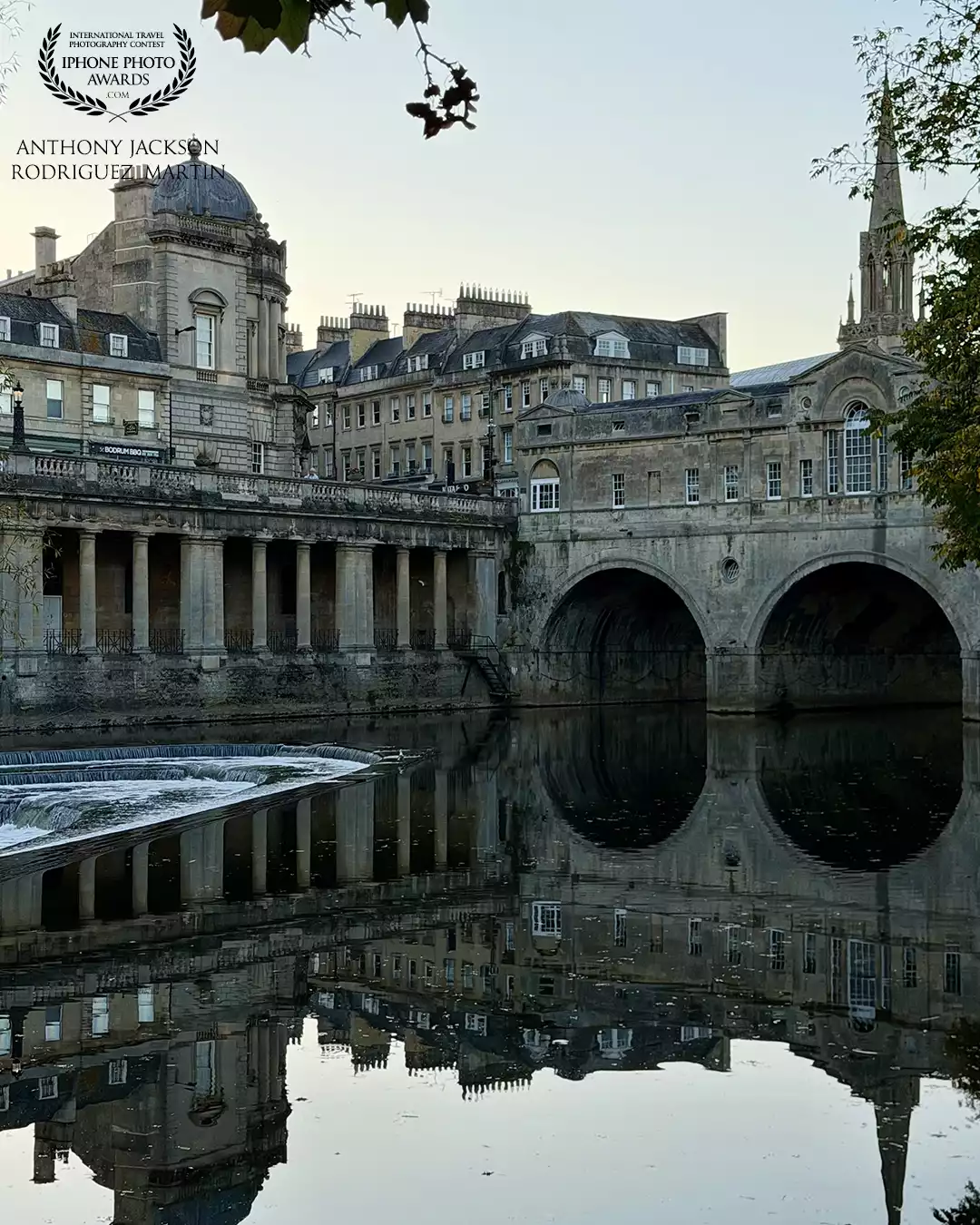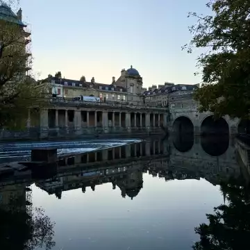 98th CollectionA serene view of Pulteney Bridge in Bath, England, reflected perfectly in the calm River Avon under soft evening light.