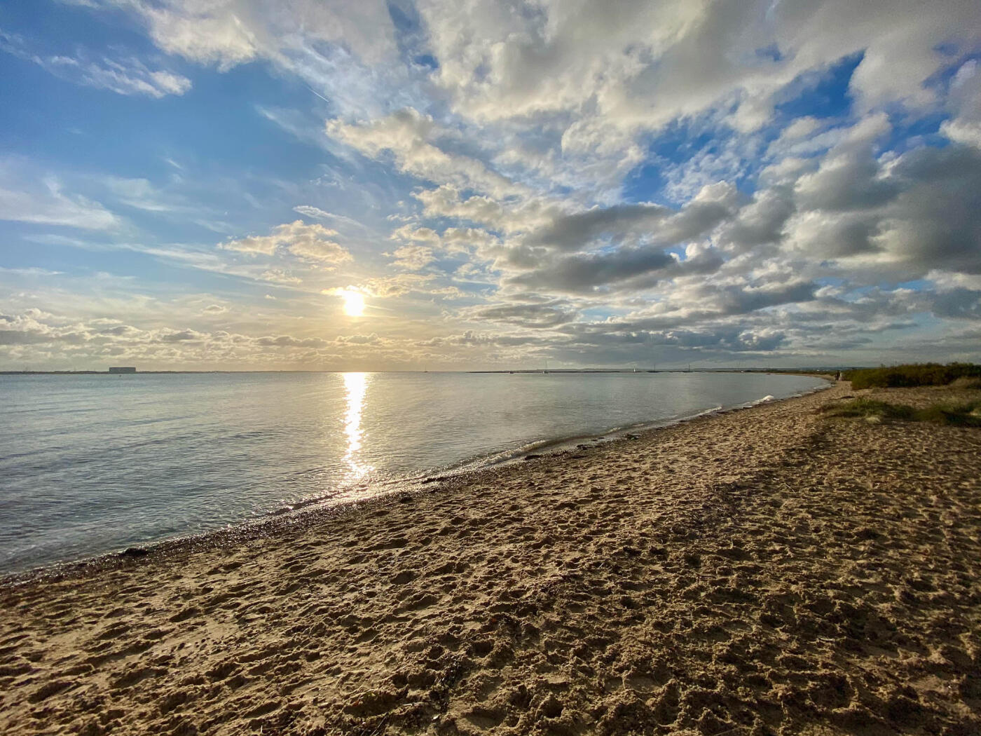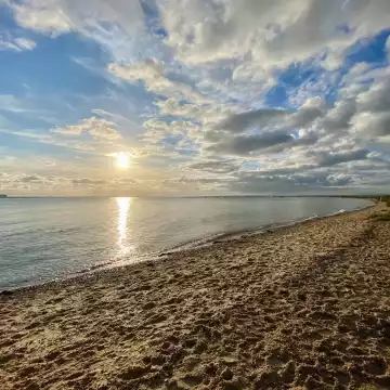 102nd CollectionSunbeams break through heavy clouds over a quiet waterside landscape, casting soft light across the river, grassy banks, and distant tree line.