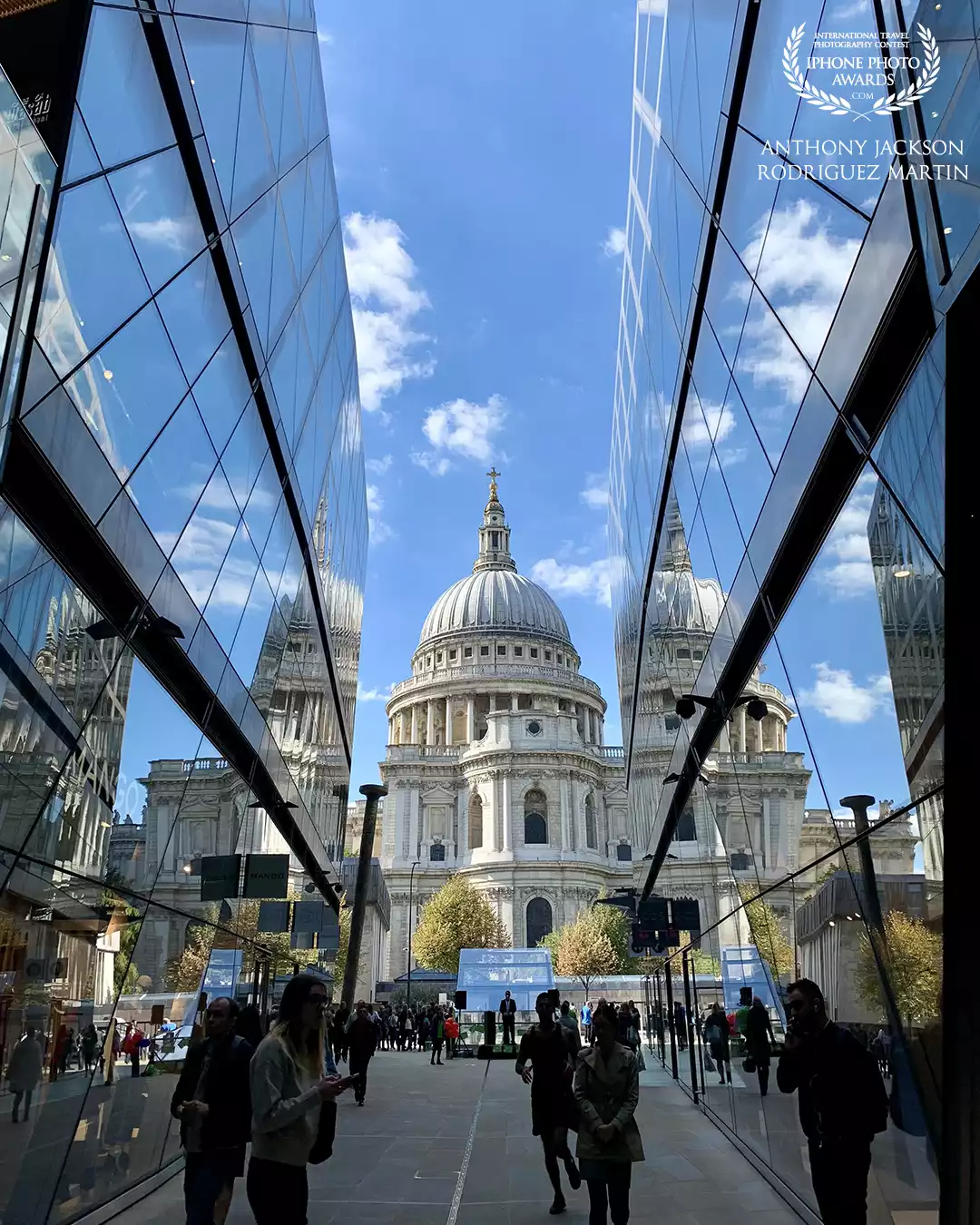 97th CollectionA beautiful view of St Paul Cathedral under a blue sky, reflected in modern glass building with a busy crowds walking.