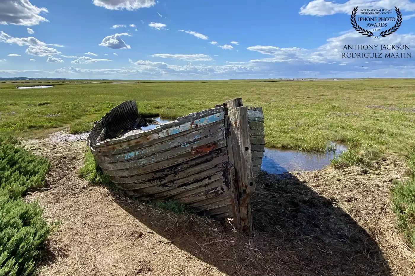 97th CollectionThe old wooden boat resting in a grassy marsh under a bright blue sky with scattered clouds. Blakeney - Norfolk