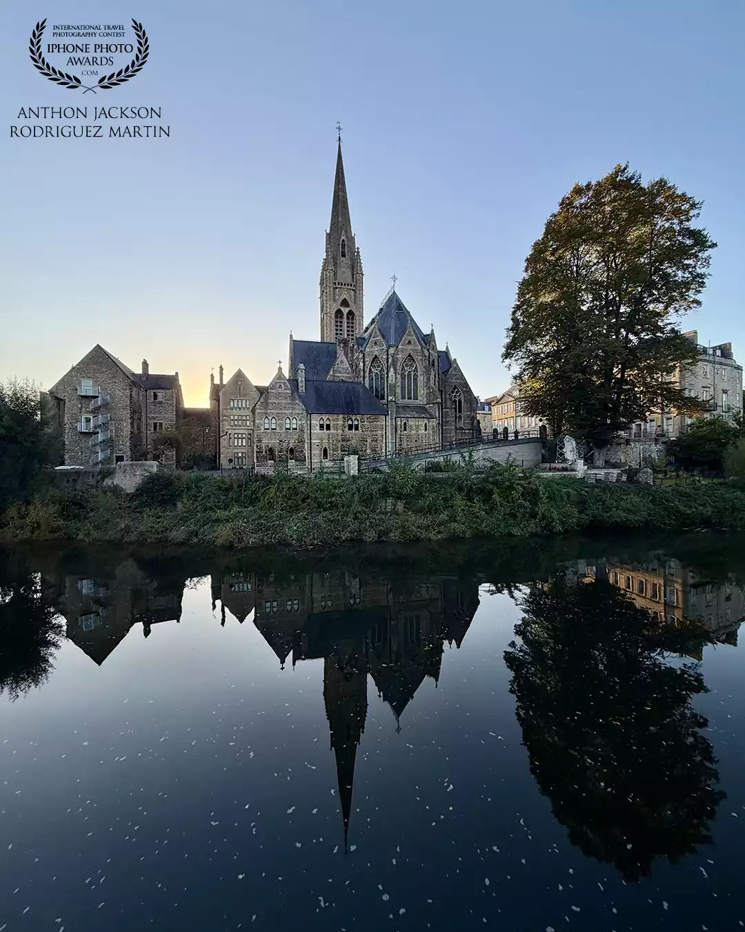 98th CollectionThe beautiful St John's Church in Bath with the tall steeple reflects in the calm river at the golden hour, surrounded by trees and amazing old architecture.