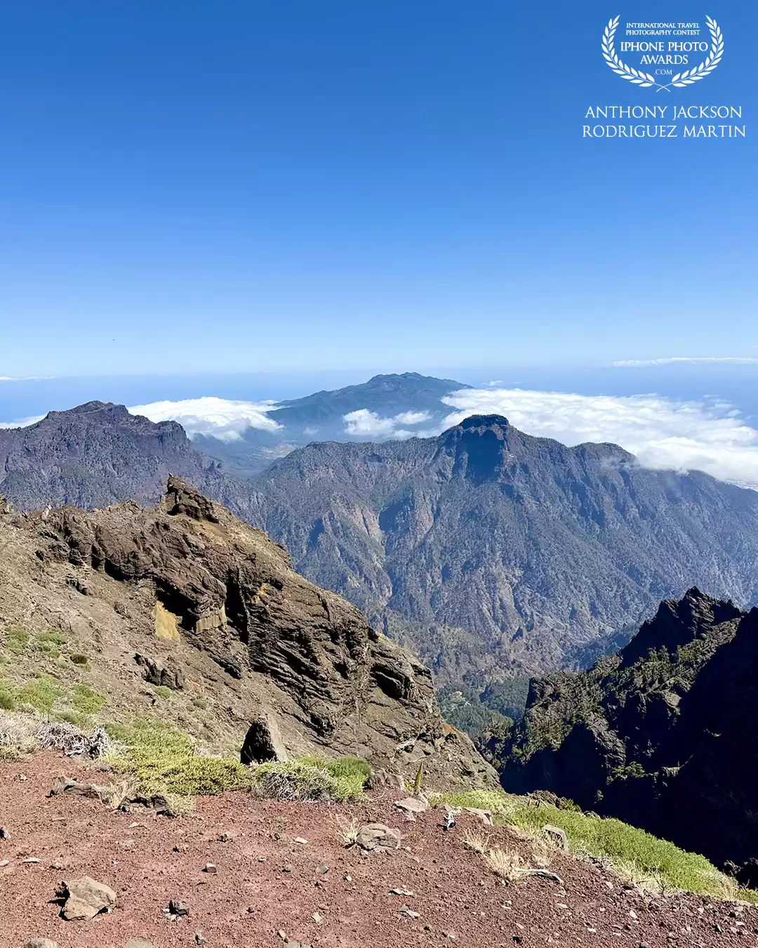 98th CollectionA breathtaking view from the peaks of La Palma’s Caldera de Taburiente presenting rugged volcanic cliffs, lush valleys, and a sea of clouds under a brilliant blue sky.