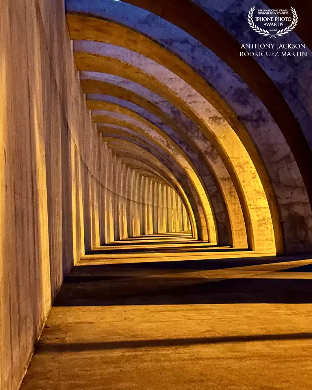 98th CollectionA striking architectural tunnel with repeating arches, illuminated by warm golden and cool blue light, creating depth and symmetry. Tazacorte - La Palma