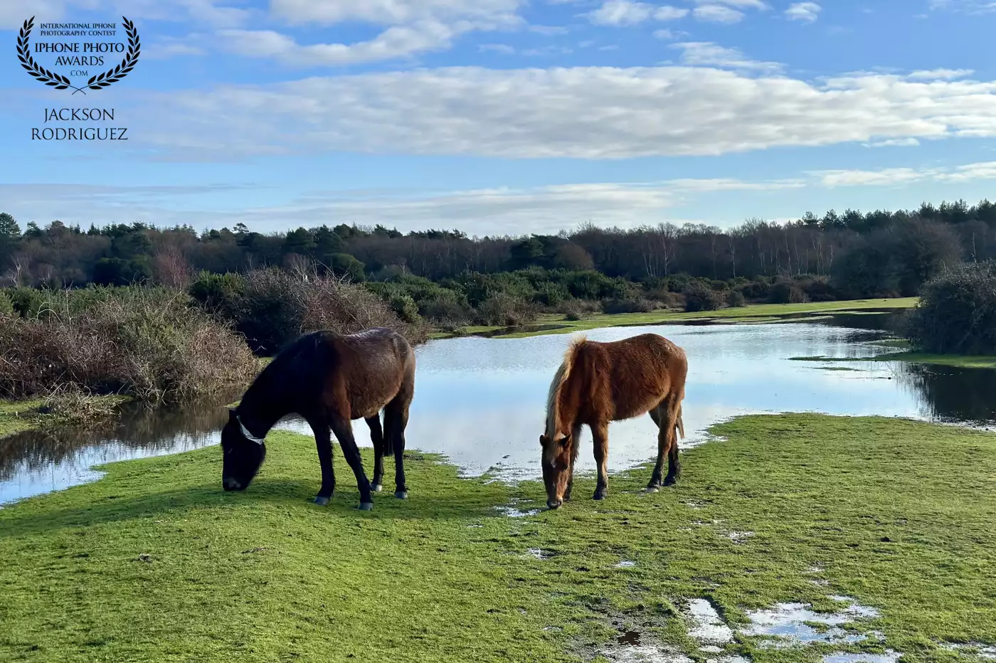 99th CollectionTwo ponies graze peacefully on a lush, wet meadow beside a still pond, surrounded by low shrubs and distant woodland under a bright, partly cloudy sky. New Forest, England