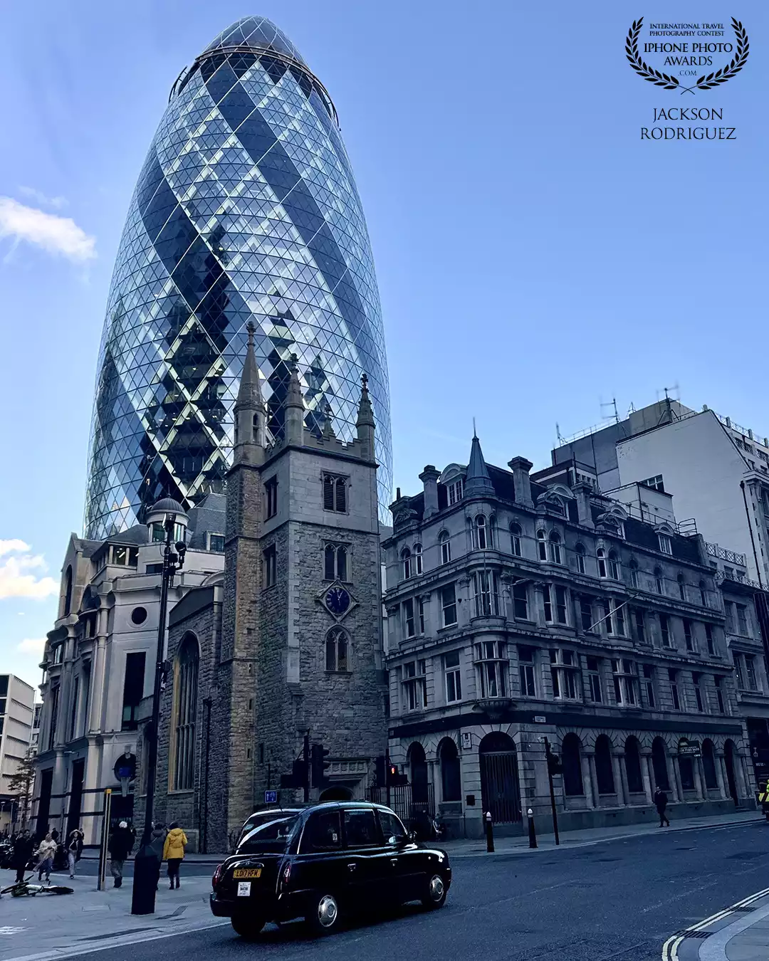 99th CollectionA modern cityscape featuring London’s iconic Gherkin building rising behind historic stone architecture, with a classic black taxi passing through the street in the foreground.
