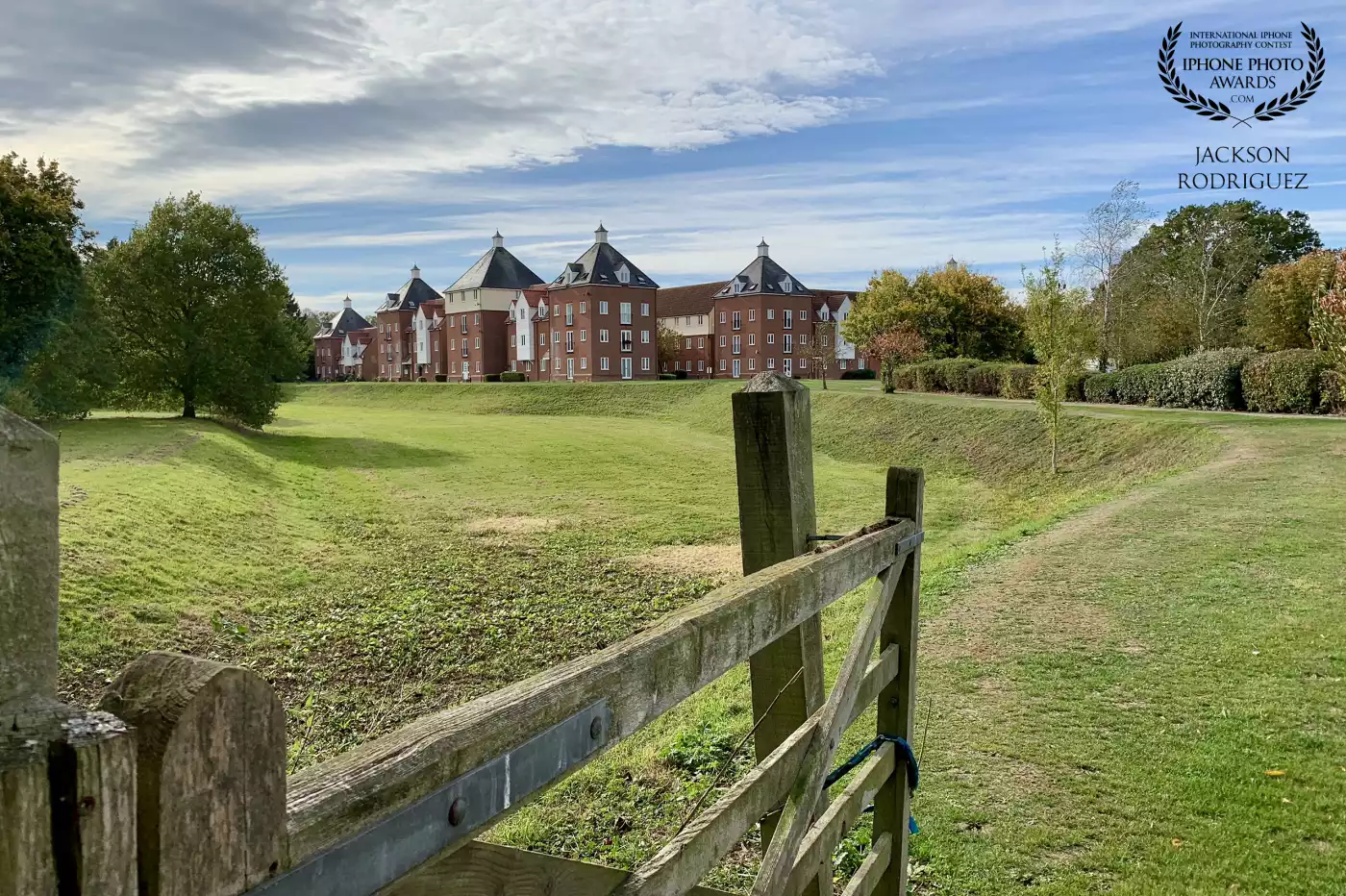 99th CollectionA peaceful green landscape with a wooden gate in the foreground, leading toward a complex of red-brick buildings under a bright, partly cloudy sky. Melba Court in Writtle, Essex, England.