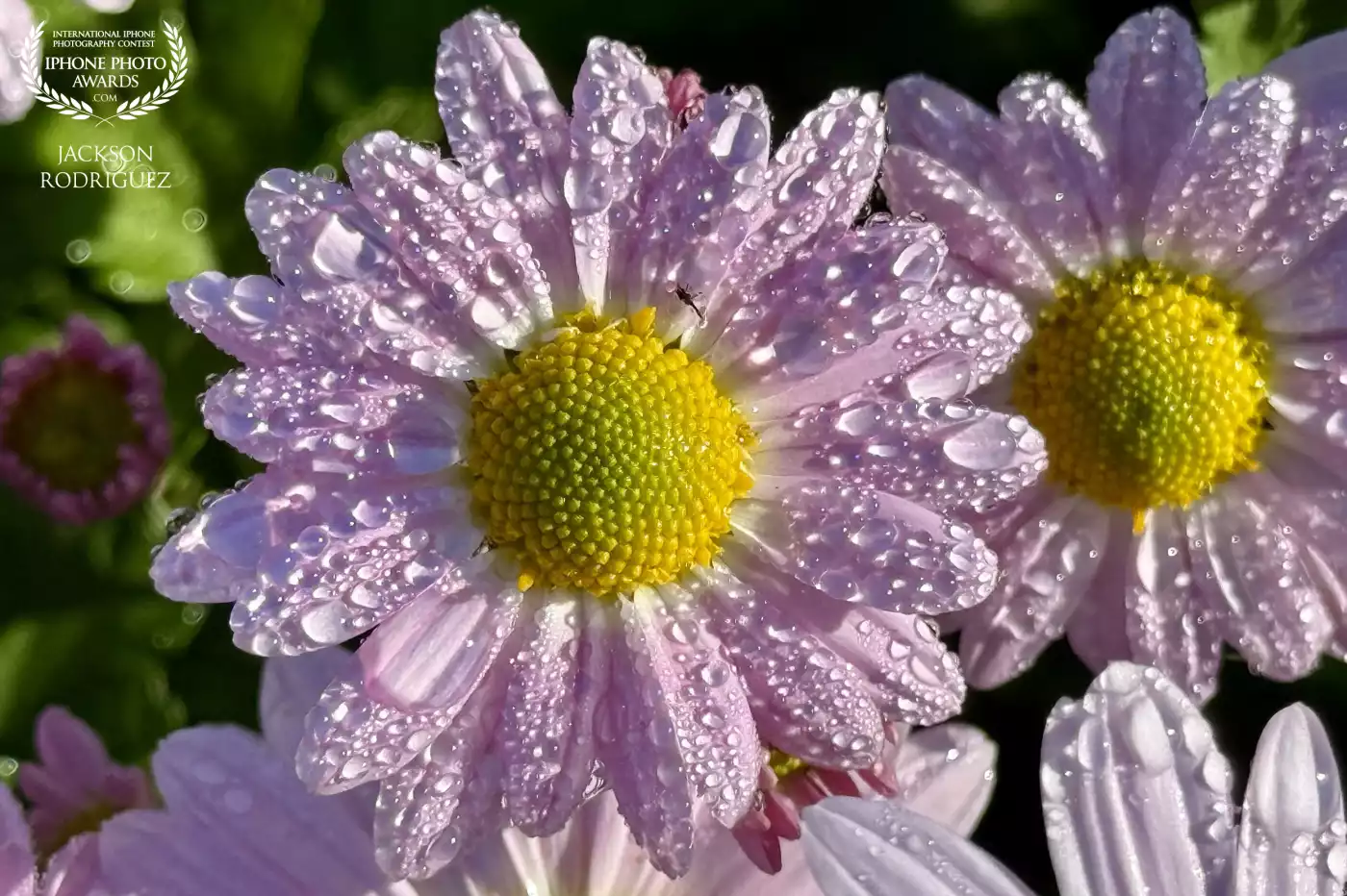 100th CollectionClose-up of delicate pink daisies covered in sparkling morning dew, highlighting their bright yellow centers in soft sunlight.