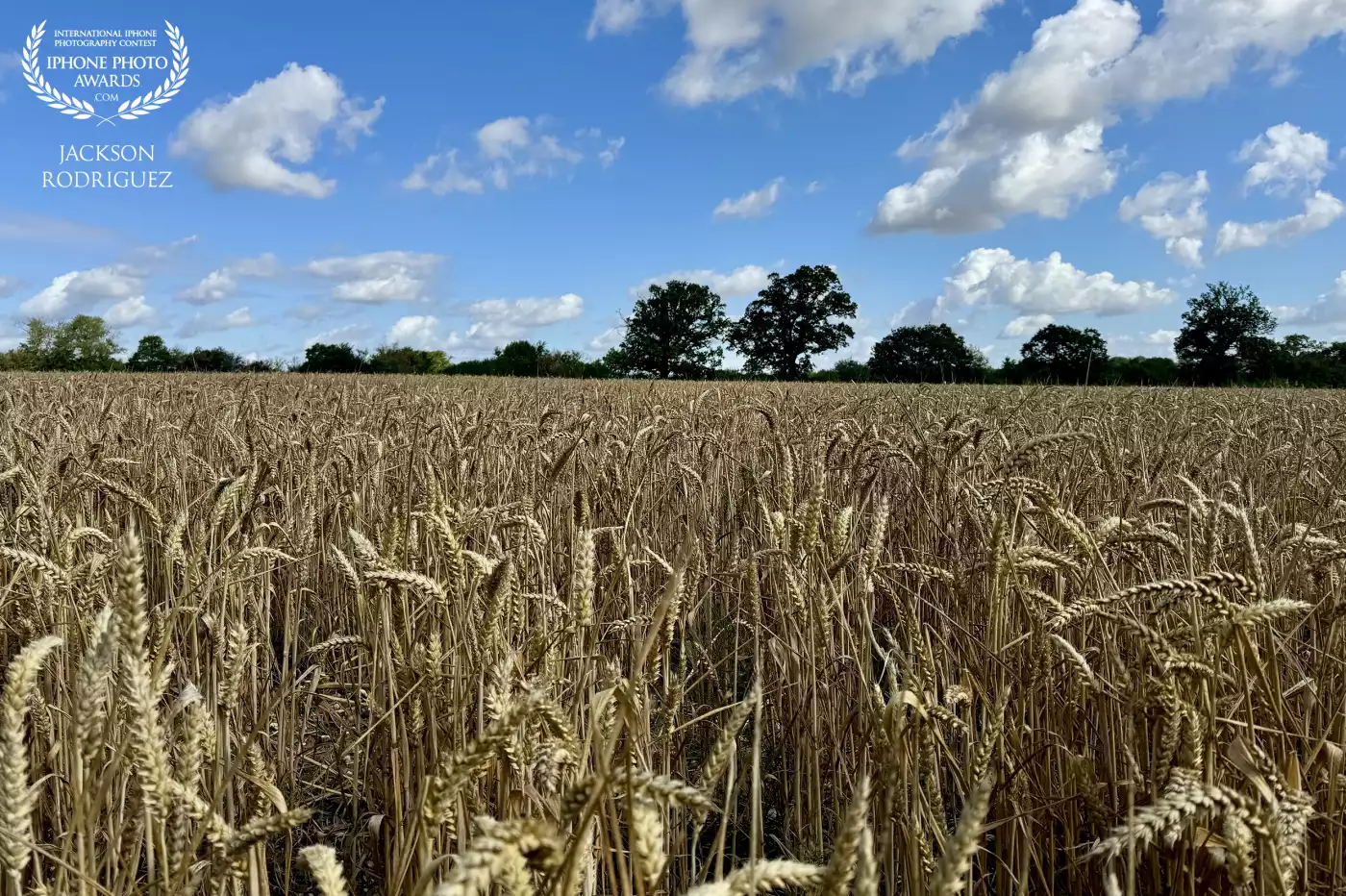 100th CollectionA wide golden wheat field stretches to the horizon beneath a bright blue sky dotted with soft white clouds, with a line of trees in the distance.