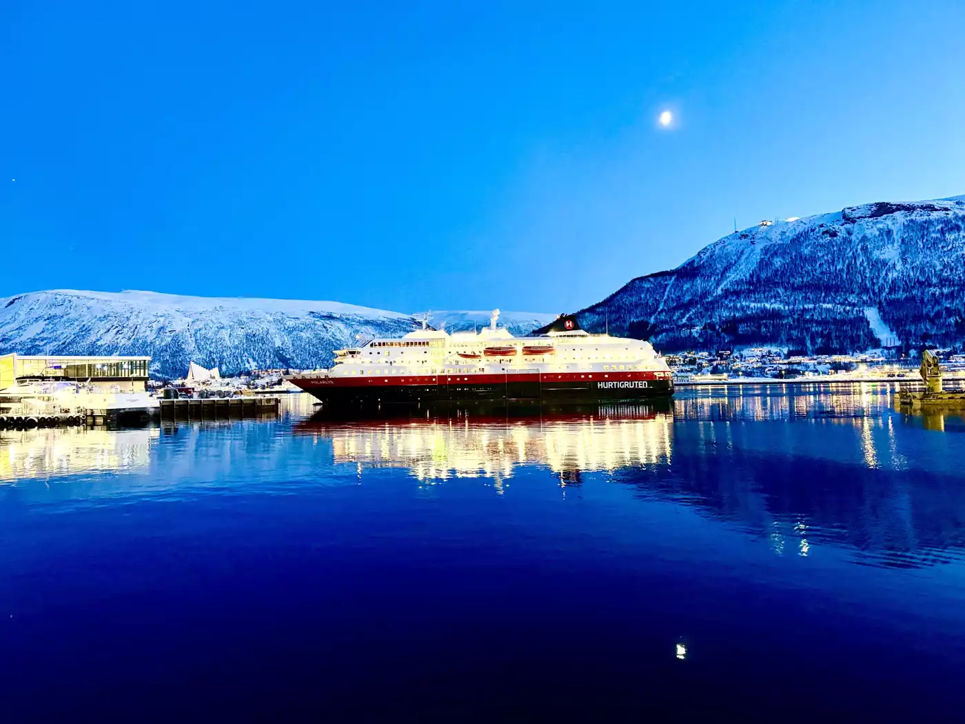 A beautiful brick building glowing with warm lights during twilight, set against a deep blue evening sky. Sopley Mill, 🇬🇧